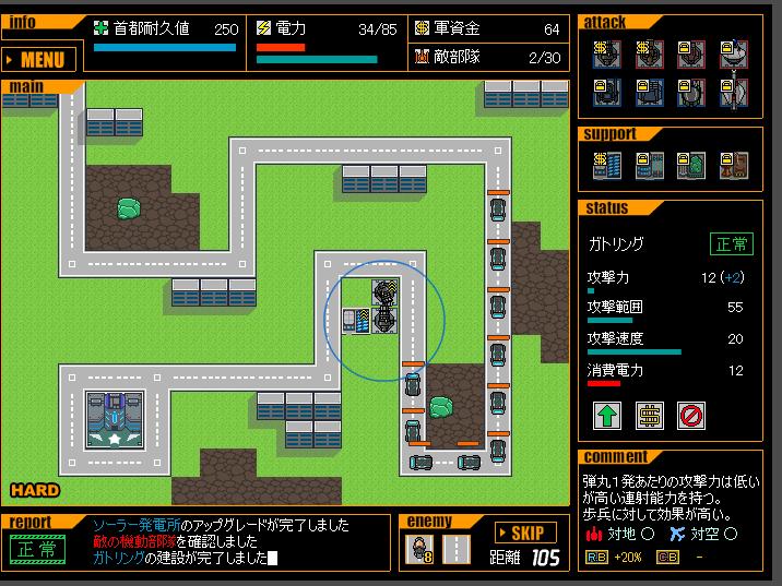 この方法で行くと上級はお金が足らず、残り5面位までレールガンが設置できない。それから素粒子砲を設置するためのお金を貯めてもたまらない。キャノンを首都付近に設置したら少し粘れるようになったが、対空が辛くなった。対空ミサイルを配備すると、レールガンが遠のく。こういうジレンマがあるゲームはおもしろい。